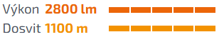 - Päť režimov svietenia: 2800 lúmenov (1,6 hodiny) -> 1000 lúmenov (2,25 hodiny) -> 350 lúmenov (6,5 hodiny) -> 30 lúmenov (42 hodín) -> stroboskop (2600 lúmenov) -> SOS 150 lúmenov (40 hodín)