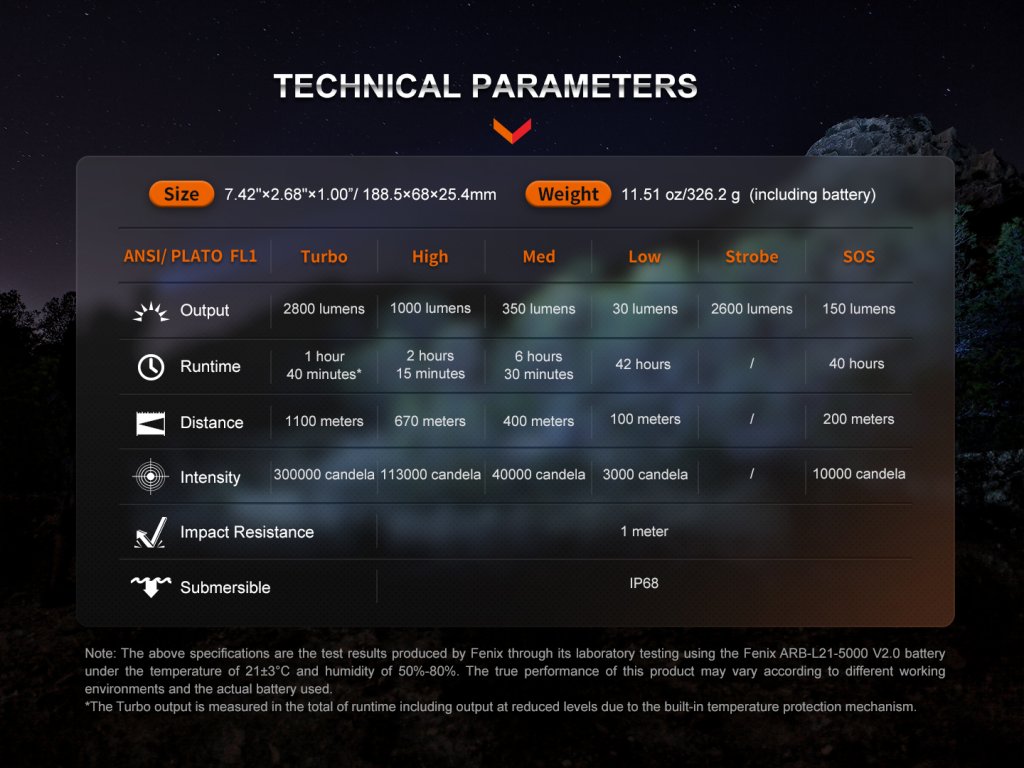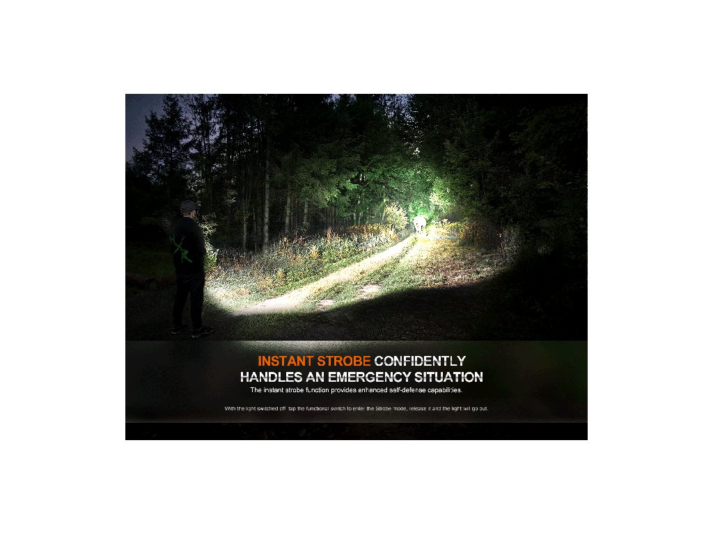 - Päť režimov svietenia: 2800 lúmenov (1,6 hodiny) -> 1000 lúmenov (2,25 hodiny) -> 350 lúmenov (6,5 hodiny) -> 30 lúmenov (42 hodín) -> stroboskop (2600 lúmenov) -> SOS 150 lúmenov (40 hodín)