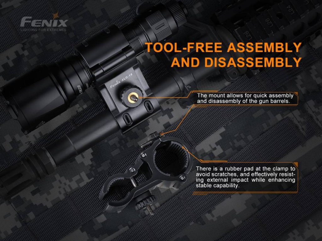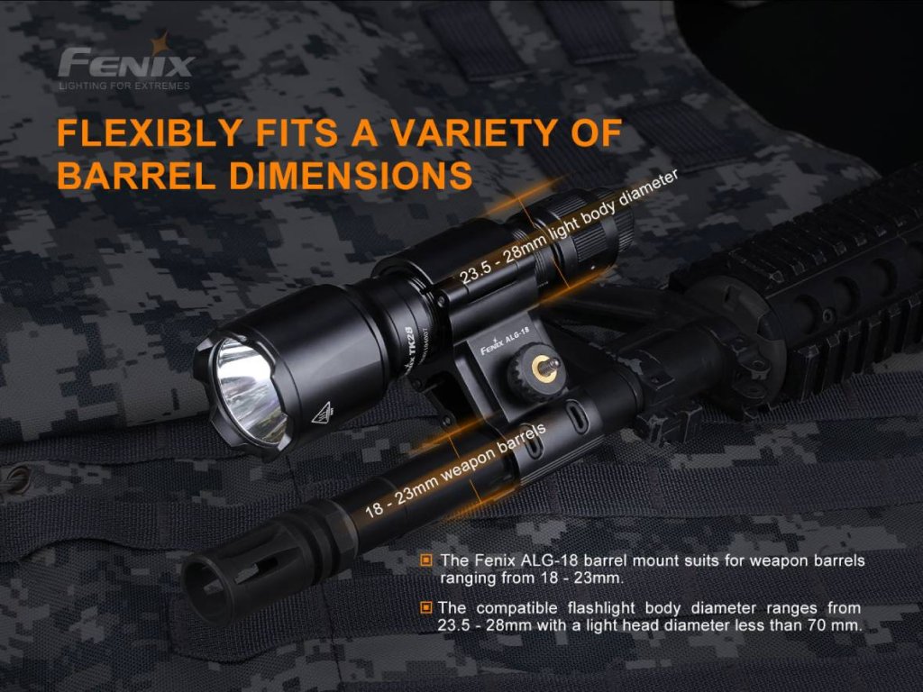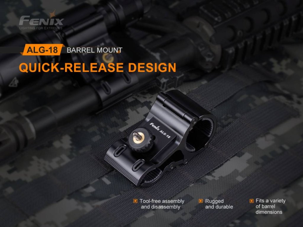 Rýchloupínacia kovová montáž Fenix ALG-18 umožňuje pripevniť svietidlo na hlaveň dlhej zbrane. Vhodná na zbrane s priemerom hlavne 18,0 - 23,0 milimetrov a svietidlá s priemerom tela 23,5 - 28,0 mm. Vhodná napríklad pre svietidlá Fenix TK11 TAC, TK16 V2.0, TK20R V2.0, TK22 UE, TK22 TAC, TK25 IR, TK25 R&B, TK25 Red, TK25 UV, TK26R, HT18, PD32 V2.0, PD35, PD36 TAC, PD36R PRO, HT30R, UC35, FD41.