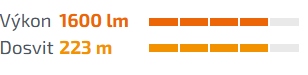 - Diaľkový reflektor pri napájaní 3400 mAh: 1600 lúmenov (1,5 hodiny) - 800 lúmenov (3,5 hodiny) - 350 lúmenov (11 hodín) - 50 lúmenov (50,8 hodiny).