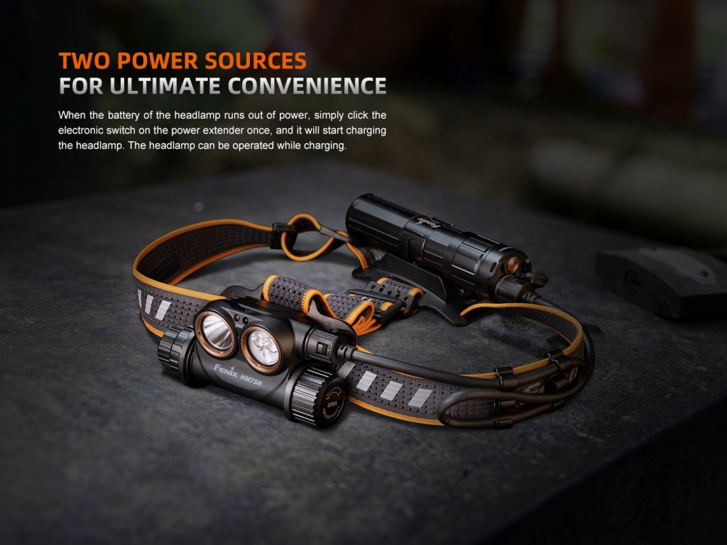 Nabíjateľná čelovka Fenix HM75R disponuje dvoma svetelnými kužeľmi s výkonom až 1600 lúmenov a silným červeným svetlom s výkonom až 120 lúmenov. Diaľkový reflektor so špičkovou LED Luminus SST-40 vytvára dobre zaostrený svetelný lúč s dosvitom až 223 metrov a druhý reflektor s výkonnými LED Luminus SST-20 má svetelnú stopu veľmi širokú a plynulú s dosvitom do vzdialenosti 60 metrov. Svetelný tok diaľkového reflektora je až 1600 lúmenov, reflektor so širokým kužeľom ponúka maximálny výkon 1000 lúmenov a neutrálny odtieň svetla. Svetlo z oboch reflektorov nemožno kombinovať, ľahko sa medzi nimi prepína otočným voličom na boku čelovky.